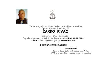 Žarko Pivac, srijeda, 11.02.2026. god., Ernestinovo u 15:00 h