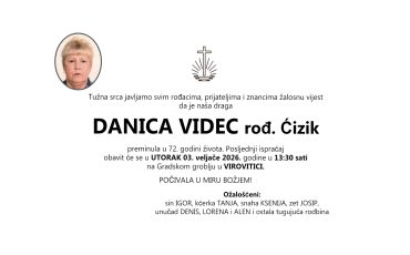 Danica Videc, utorak 03.02.2026. u 13:30h, Gradsko groblje Virovitica