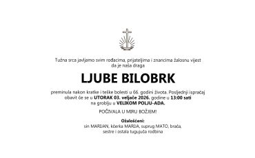 Ljube Bilobrk, utorak 03.02.2026. u 13:00h, Veliko Polje – Ada